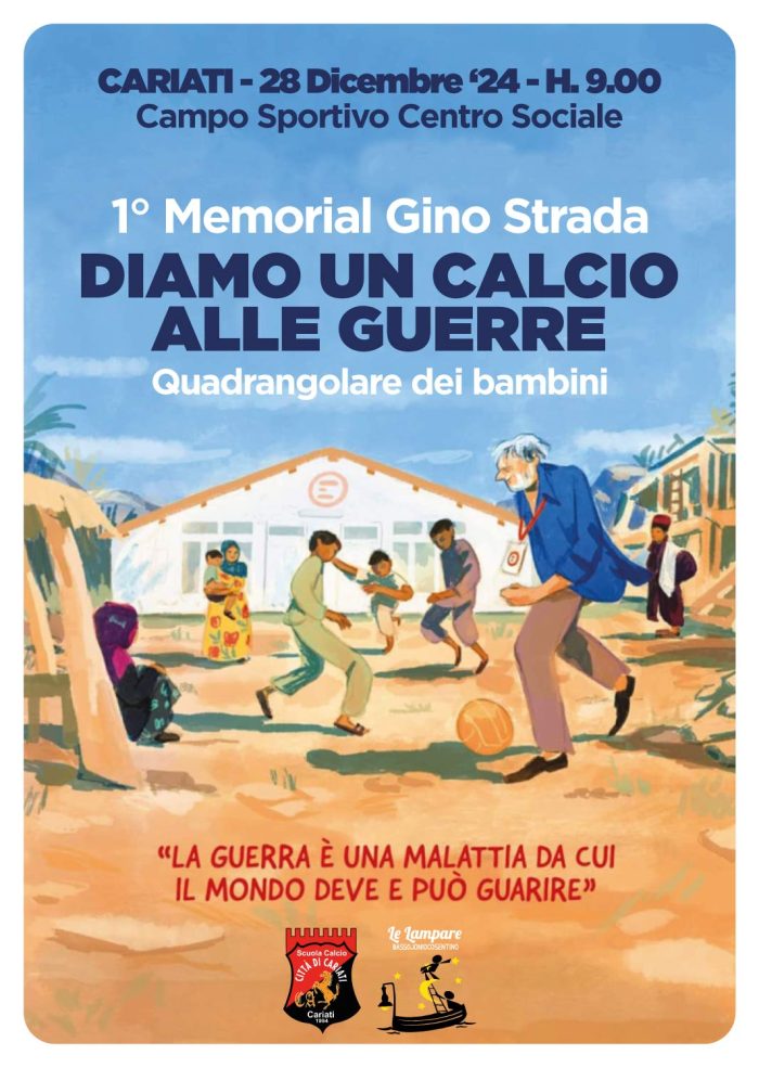 Il 28 dicembre, a partire dalle ore 9:00 e per tutta la mattinata, presso il Campo Sportivo del Centro Sociale di Cariati, si terrà un evento calcistico dedicato ai bambini e alle famiglie. Questa iniziativa speciale mira a promuovere i valori della Pace e della Solidarietà attraverso un quadrangolare di calcio in ricordo di Gino Strada.