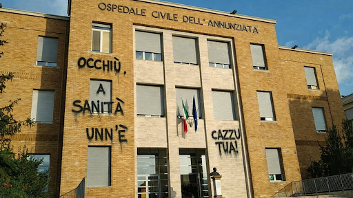 Una frase di protesta in dialetto, piazzata tra le finestre come se l’ospedale avesse deciso di farsi tatuare la frustrazione collettiva. Le scritte non sono a portata di braccio. Sono alte. Secondo l’ipotesi più accreditata, sembrerebbe che il writer si sia calato dall’alto, magari adoperando una imbracatura di quelle usate nella cosiddetta edilizia acrobatica. Certo è che nessuno ha visto o si è accorto di nulla. Gli inquirenti stanno passando al setaccio le immagini delle telecamere. Frame per frame. Zoom su ogni ombra sospetta.