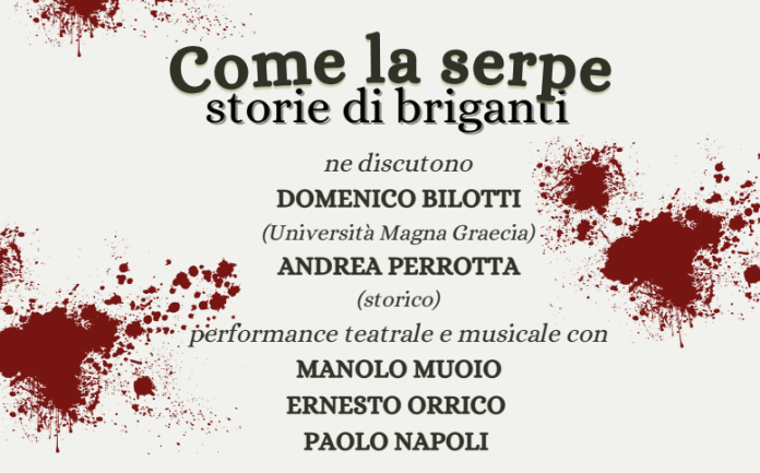 Venerdì 16 maggio, nella bella cornice artistica del Centro di aggregazione giovanile Cesare Baccelli di Marano Principato, presso la Sala Teatro, si terrà a partire dalle ore 19 l’iniziativa-evento “Come la serpe. Storie di briganti“, organizzata dall’Istituto per gli studi storici – ETS, con il patrocinio del Comune di Marano Principato.