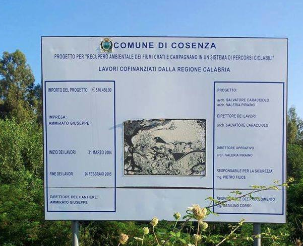 Siamo nella zona di viale Magna Grecia. Quello che abbiamo fotografato è un cartellone che avvisa la comunità dell’avvio dei lavori di un importante progetto per il recupero ambientale dei fiumi Crati e Campagnano in un sistema di percorsi ciclabili.